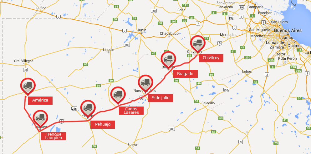 Miércoles – Salida a Ruta 5 roberto pagano19 mayo, 2015Miércoles, Recorrido, Ruta 5 Chivilcoy >> Bragado >> 9 de julio >> Carlos Casares >> Pehuajo >> Trenque Lauquen >> América.